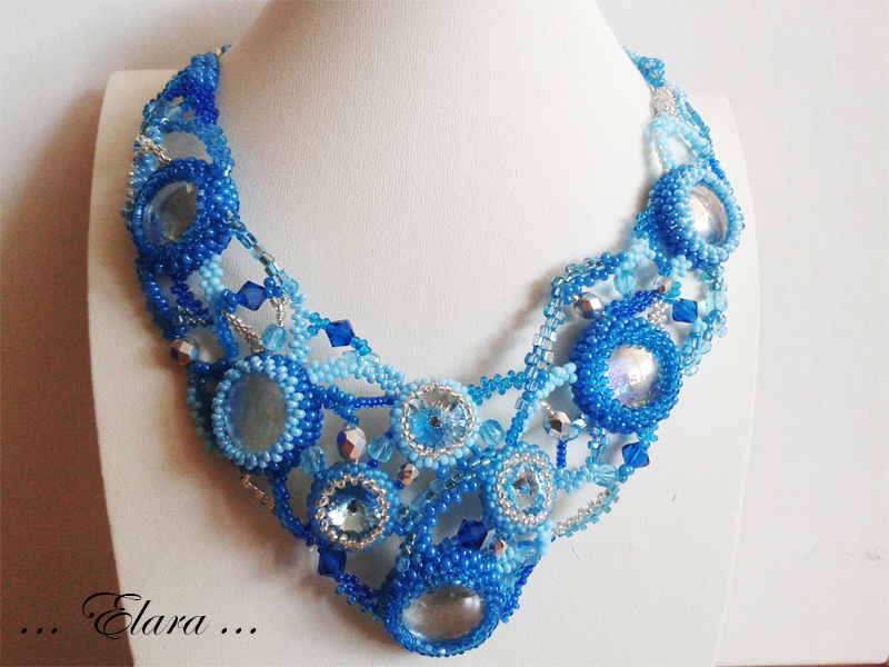 Na náhrdelník jsem použila různý rokajl, skleněné čočky a rivoli swarovski