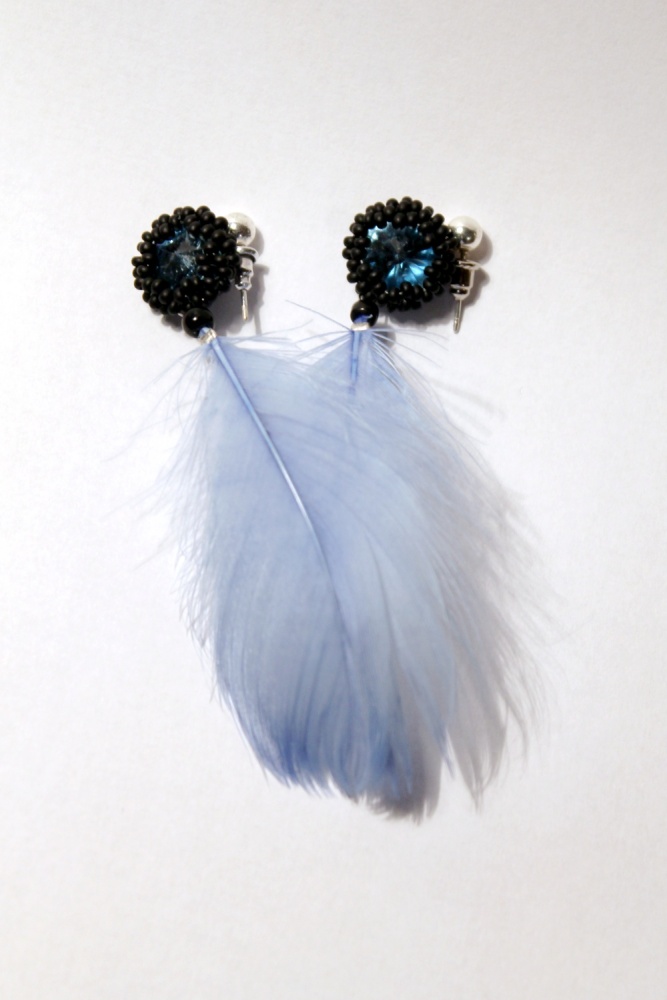 Světle modré rivoli obšité matnými černými korálky doplněno o modrá pírka. :) :)