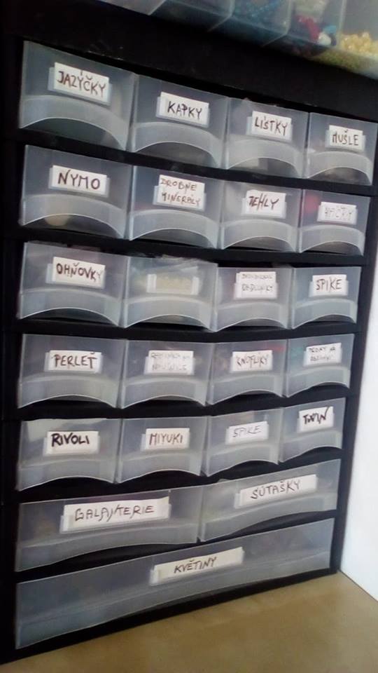 Nejdete zde vše korálky různých barev tvarů a velikostí, drátky, šňůrky, voskovky, perličky,ohnovky, kytičky , řetízky ....prostě vše.Dělala jsem jak jednoduché tak šité šperky. Vše je kupované na eshopech za normální ceny (ne velkoobchodní) byl to koníček :)