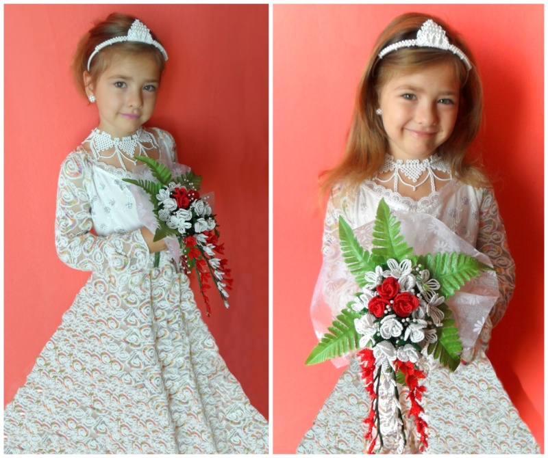 Svatební kytice a moje malá neteř jako modelka. Korunka i náhrdelník je též z mé dílny ;)