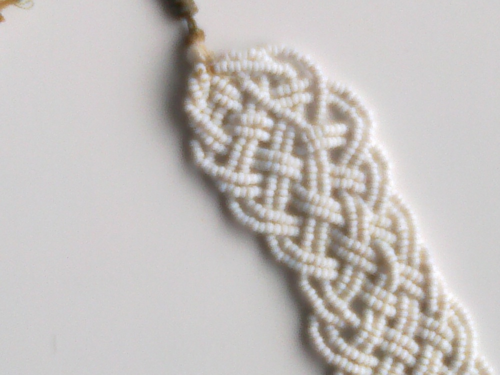 Asi bych udělala jinak zakončení (tohle se mi nelíbí). Ušila bych si proužek (plochým stehem nebo na stávku) 4 korálky na výšku, 12 na šířku a do každého korálku bych připojila dlouhý návlek. Návleky bych po 2 spletla do pletence (s délkou nutno experimentovat) a vytvarovala ho do kruhu (možná podle papírového střihu, který bych vyzkoušela na sobě, jestli padne) a upravila tvar náhrdelníku a délku návleků. Potom bych konce návleků přišila k druhému korálkovému pásku. Protáhla bych vnitřním obvodem již zmíněnou nit s doplňkovými korálky, tím se hezky upraví tvar a zpevní se obvod a zapošila ji do korálkových zakončovacích pásků. Teď už zbývá jen zapínání, třeba kulička a poutko z korálků.